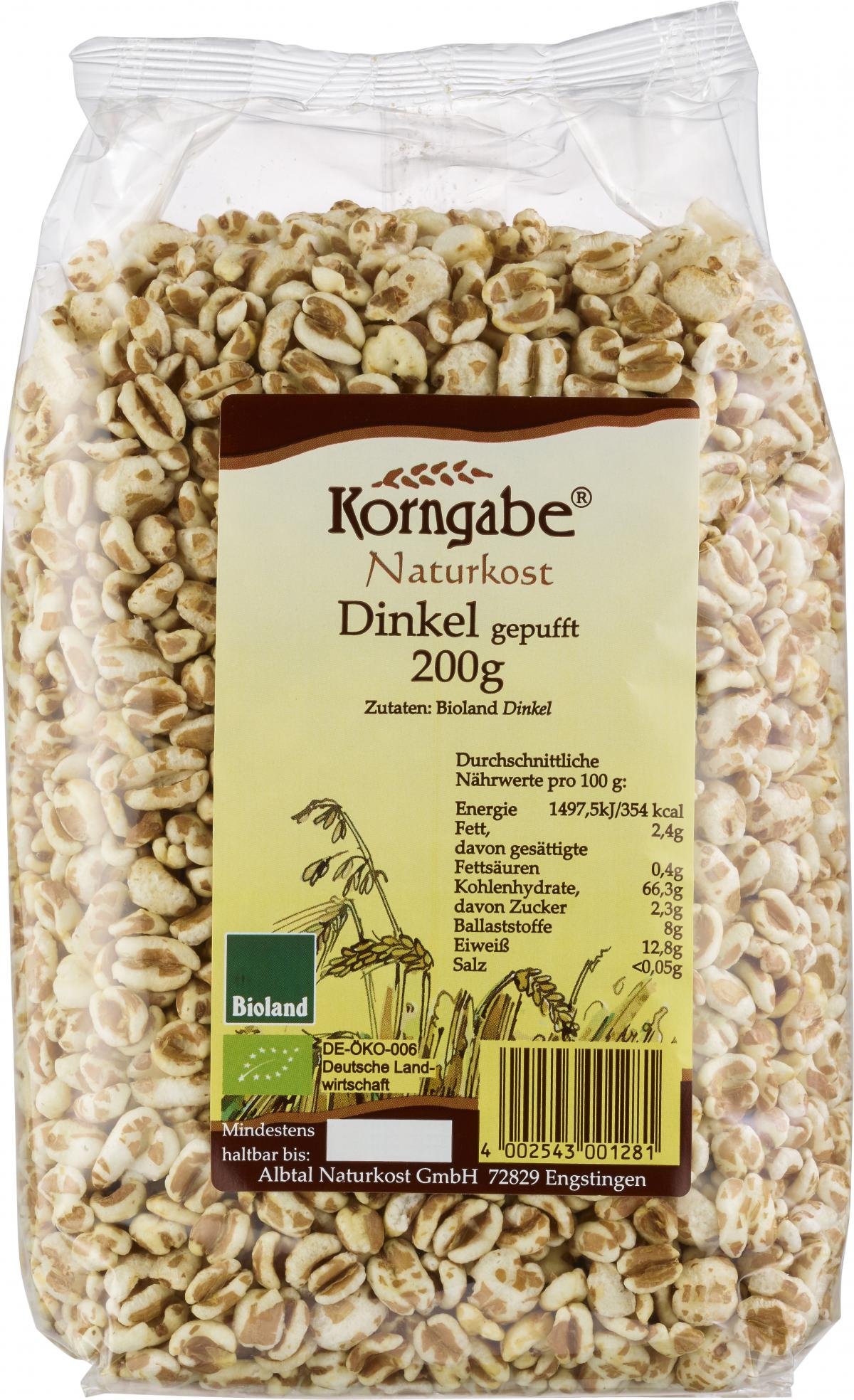 Korngabe Dinkel gepufft ungesüßt, 200 gr Packung